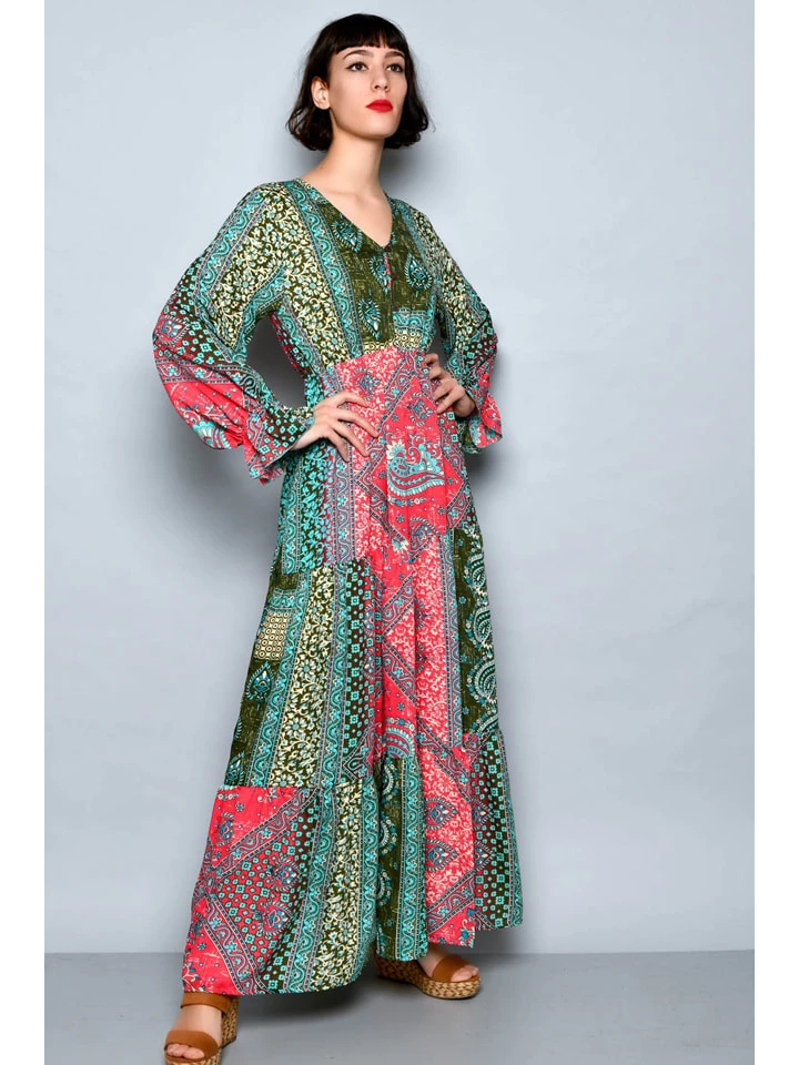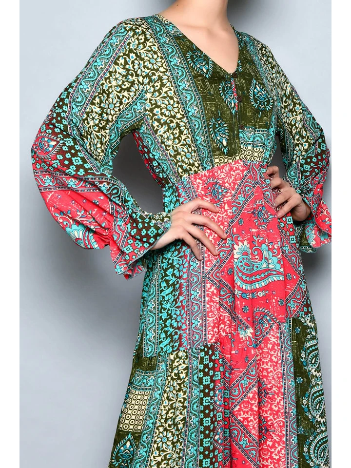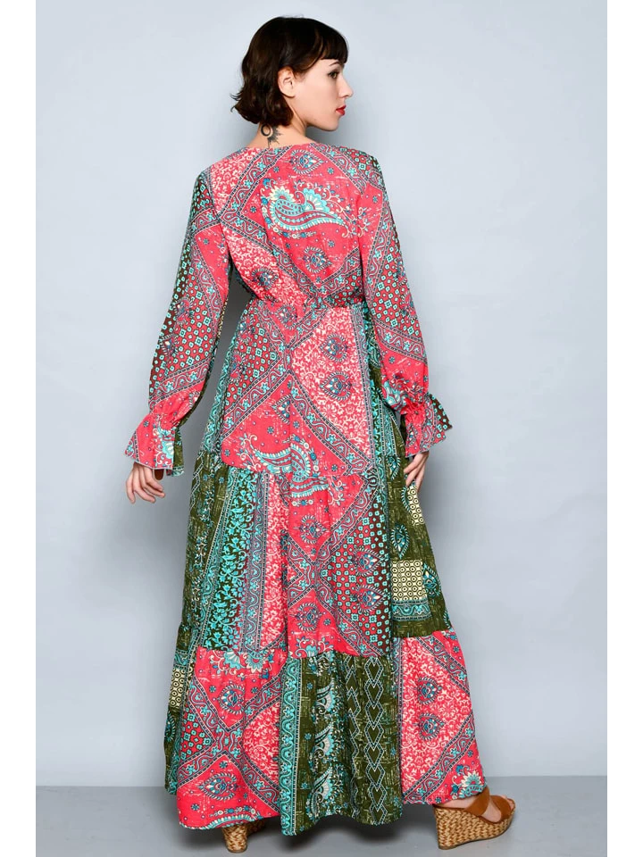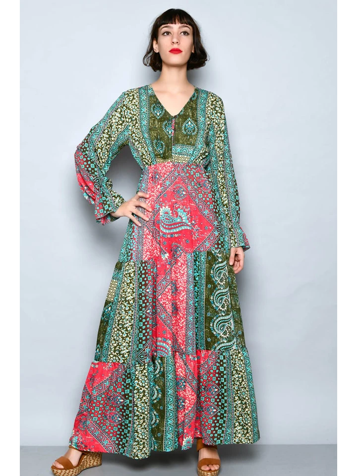Jurk Groen/koraalrood/beige